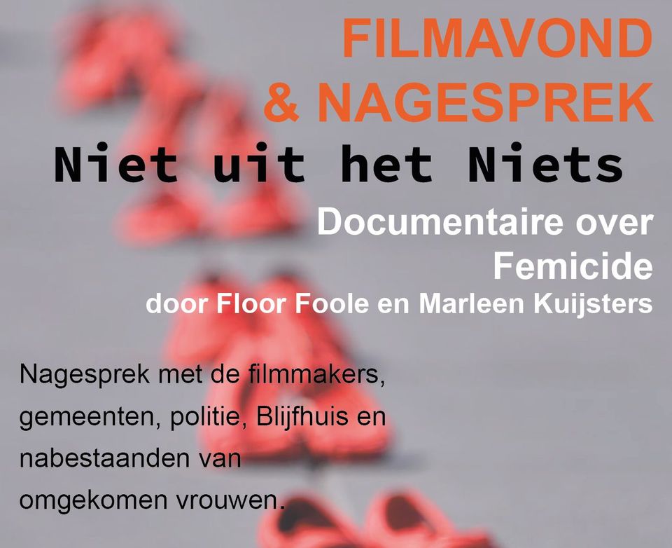 De film ‘Niet uit het Niets’ zal vertoond worden, een indringende film over fataal geweld achter de voordeur. De film is gemaakt door twee jonge journalisten/filmmakers en is onlangs in première gegaan. Aan het nagesprek zullen de filmmakers, vertegenwoordigers van diverse gemeenten en politie deelnemen, maar ook Blijfgroep Zaanstreek/Waterland en nabestaanden van vrouwen die door femicide om het leven zijn gekomen.