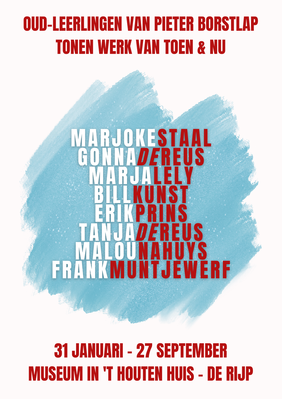 Dit maakt het verschil zichtbaar tussen de tijd waarin zij van Borstlap les kregen en de kunstenaars die zij nu zijn. Vroege werken, gemaakt onder zijn begeleiding, staan naast recent werk waarin ieder een eigen richting en handschrift heeft ontwikkeld. Kom de werken bewonderen van Malou Nahuys, Marja Lely, Bill Kunst, Gonna de Reus, Tanja de Reus, Frank Muntjewerf, Erik Prins en Marjoke Staal.