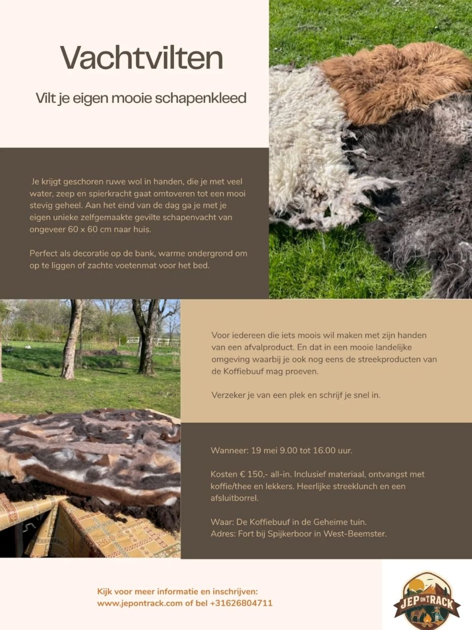 Aan het einde van de dag ga je naar huis met een unieke, zelfgemaakte gevilte schapenvacht van ongeveer 60x60 cm. Perfect als decoratie op de bank, warme ondergrond om op te liggen of zachte voetenmat voor het bed.